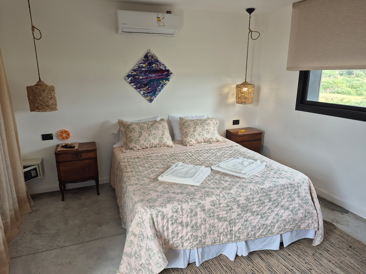 Esta acogedora habitación privada es perfecta para quienes buscan privacidad y practicidad en Punta del Este. La habitación cuenta con cama doble, tv cable, aire acondicionado, baño en suite y conexión wifi gratuita. Ideal para relajarte después de un día en las cercanas Playa Brava o Playa Mansa. Disfruta de tu espacio mientras conoces gente linda en Pastora. La mejor ubicación!