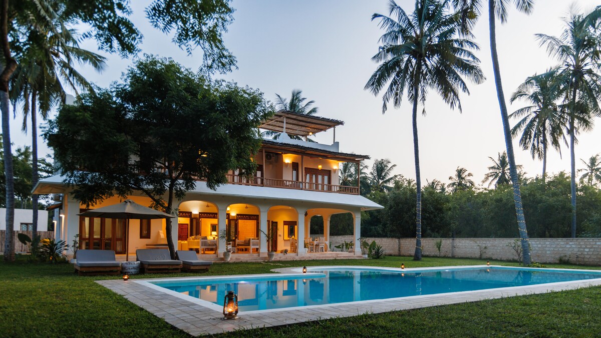 Casa de estilo suajili tradicional, se encuentra en el promontorio de coral con vistas al mar, la playa, hermosos jardines de flores, acceso privado a la playa. Piscina instalada recientemente, CONSULTA LAS NORMAS DE LA CASA La villa tiene 2 niveles y vistas al océano Índico, acceso directo privado a la playa, que se extiende a ambos lados, dentro del Parque Marino. Incluye 3 empleados, cocinero y servicio diario a la habitación, y jardinero. Capacidad para 10 personas. Se adapta fácilmente y se hace cómodo para alojar grupos más pequeños, utilizando solo los dormitorios de arriba.