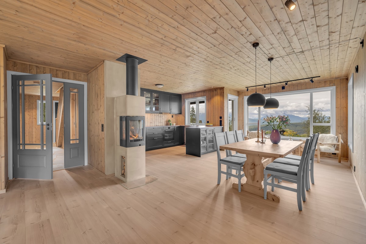 Cabaña moderna y de nueva construcción con gran sala de estar e impresionantes vistas a través de ventanas del piso al techo. Disfruta de tu café por la mañana en la buena silla, el fuego en el horno y la vista antes de salir a esquiar. La oficina de la cabaña funciona muy bien con una línea de fibra rápida. Por las noches puedes encender la parrilla y el fuego bajo las luces del norte. O mira tus series favoritas en la televisión grande de la sala de estar. Dos de los dormitorios también tienen televisores con aplicaciones. Los televisores no tienen TV lineal. Toallas y ropa de cama incluidas Cargador de coche disponible para los huéspedes