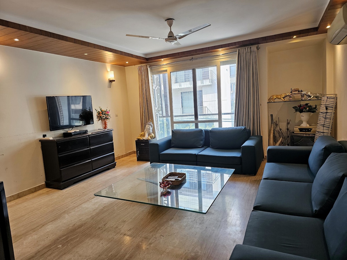Esta es una nueva y elegante 2BRandBath situada en una tranquila colonia cerrada con 2 parques a 100 metros del metro de Lajpat. Es La casa cuenta con una cocina totalmente funcional, Internet de hispeed, entrada privada, ascensor y estacionamiento. El mercado de Khan, la puerta de la India está a pocos minutos en metro. La zona está rodeada de un mercado vibrante, tiendas las 24 horas, muchos restaurantes locales y es totalmente accesible en Uber, Metro y Auto. Consulta las reseñas :) Ten en cuenta que no está en la colonia de Defensa