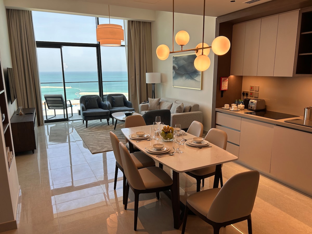 Para ser mimado y tratado con respeto. Un apartamento de dos dormitorios con vistas al mar (1 cama tamaño king, 1 cama tamaño queen), con sala de estar, dos baños, cocina y dos hermosos balcones en Address Residence. Equipada con: * 3 televisores, * microondas, * horno, * estufa, * lavadora y secadora, * nevera y congelador, * plancha, * tostadora, * lavavajillas, * caja de seguridad, * calentador de agua, * relojes despertadores, * cargador de teléfono, & * secador de pelo. Acceso a: * playa, * piscinas,