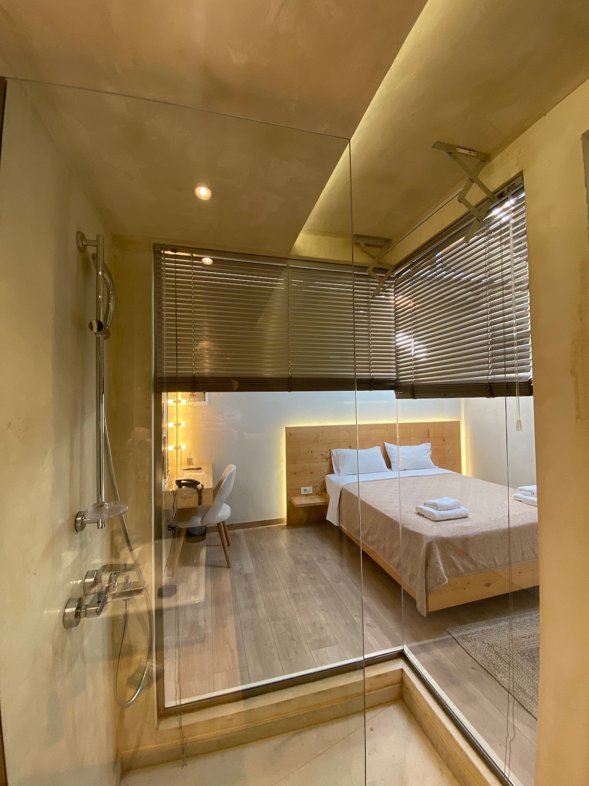 This unique suite combines our philosophy of marrying the traditional and the modern with natural materials. The iron bed with the wooden sofa in front of the stone fireplace together with the glass spacious luxury bathroom create the perfect harmony and warmth. Drink your coffee on the terrace in front of the garden under the stone arches that will offer you coolness.
