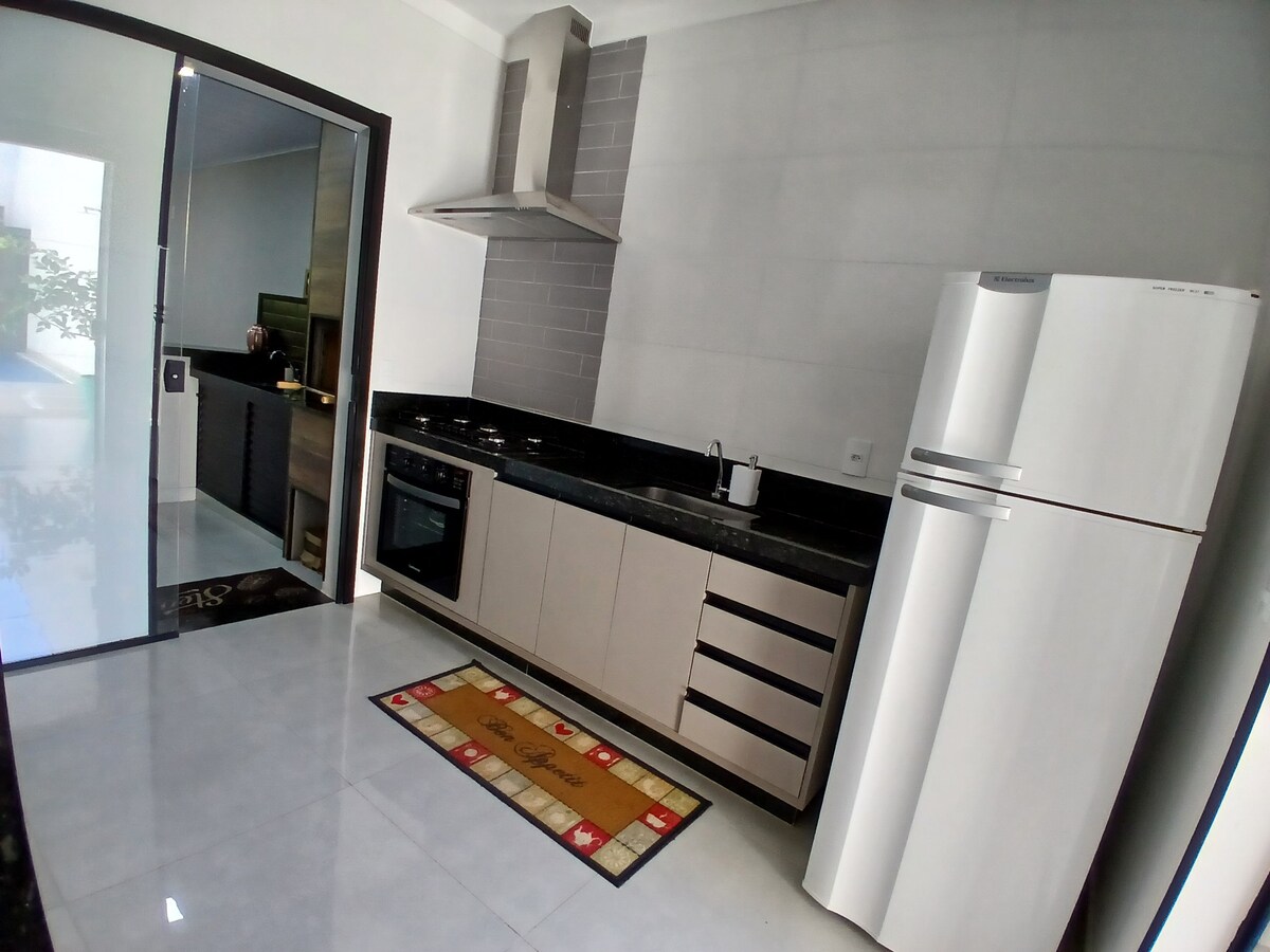 Sua família vai estar perto de tudo ao ficar neste lugar bem-localizado. Os ambientes são amplos e climatizados. Área gourmet completa, com mesas cadeiras e talheres, além de máquinas de gelo e café em grãos. Piscina com aquecimento solar ( pode não estar quente, dependendo da estação), banheiro masculino e feminino. Acomodacões para 16 hóspedes 1 suite e 2 quartos com banheiro compartilhado. No salão de festas, que é integrado com área gourmet, temos som ambiente,bem como na area da piscina.