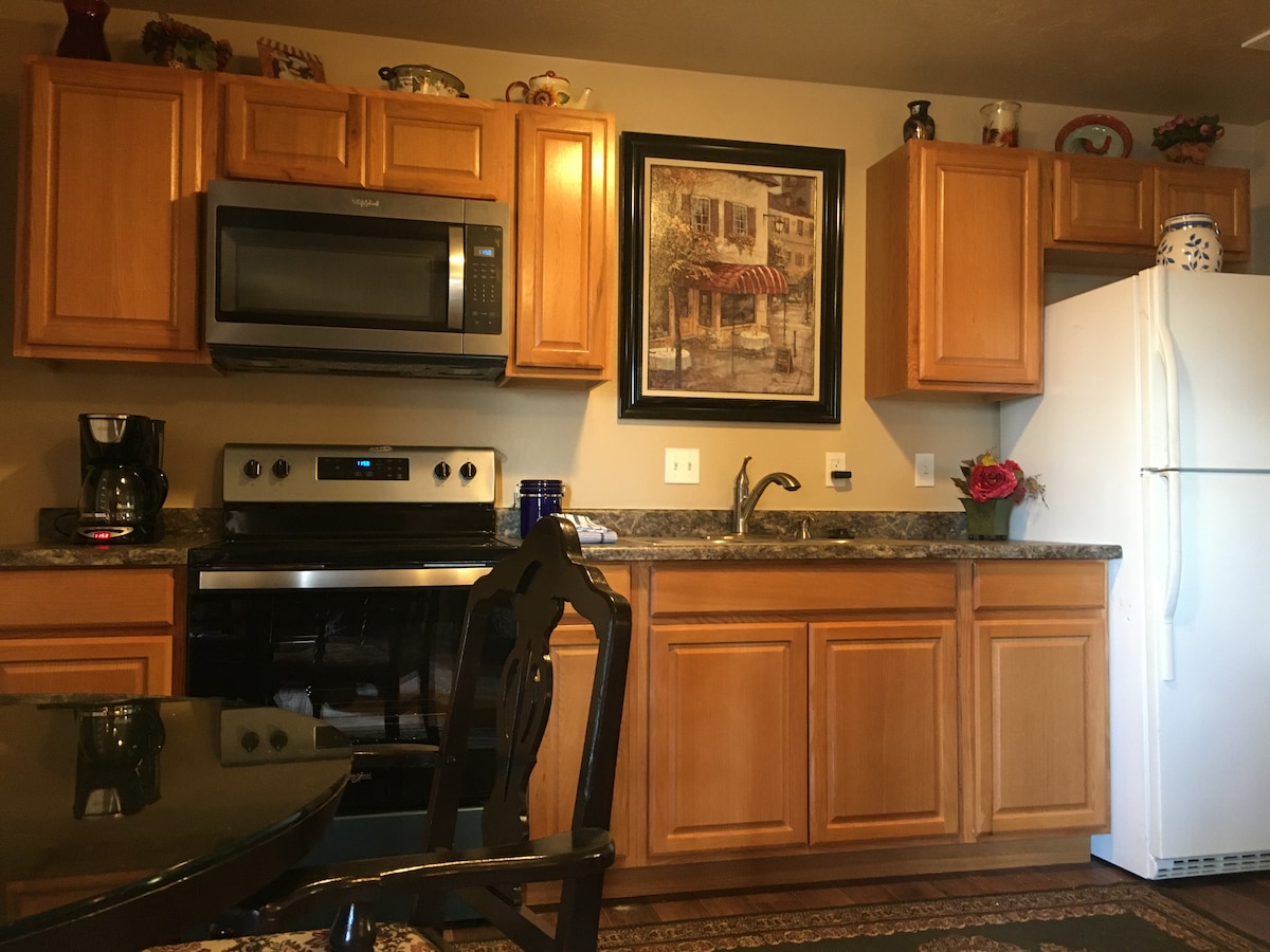 Este es un alojamiento tipo departamento tipo estudio con 2 camas tamaño queen. No hay paredes compartidas con la casa principal, pero el gran patio delantero cubierto es compartido, con una pantalla de privacidad. Estar cerca del Parque Nacional de Yosemite y de Bass Lake es una ventaja, pero Oakhurst tiene senderos para hacer senderismo, un cine, un parque comunitario, todo tipo de comida y una microcervecería. Se respetará tu privacidad. El anfitrión es amable y está dispuesto a ayudar con cualquier pregunta o inquietud cuando se lo contacta.