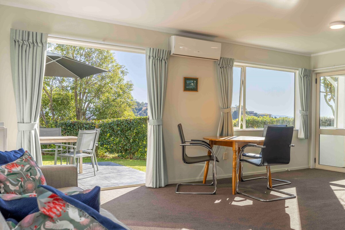 Escápate del ajetreo y relájate en nuestro tranquilo y resplandeciente oasis. Estaciona a la puerta de este tranquilo y elegante y espacioso apartamento en la ladera con puertas francesas a un patio soleado y césped con barbacoa/muebles de exterior. Despiértate con melodías de aves nativas, vistas al mar, increíbles puestas de sol y mucho espacio. Cocina completa, lavandería propia, un baño con bañera y ducha y un wc separado. Dos dormitorios con camas tamaño queen y mantas eléctricas (de abril a noviembre). Aire acondicionado y calefacción para comodidad durante todo el año