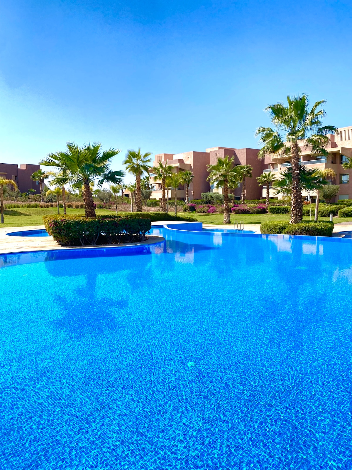 3 Bedroom stylish apartment with a swimming pool in Prestigia Golf Resort right in the city center. Niched in a perfect location, very close to the airport, and only a few minutes away from the Medina, the Mamounia and M Avenue. Enjoy large smart TV for Netflix, comfortable bedding and amazing views on the golf overlooking the Atlas Mountains. The apartment is inside a golf residence with security, a club house, swimming pools and a golf course with breathtaking views of the Atlas Mountains.