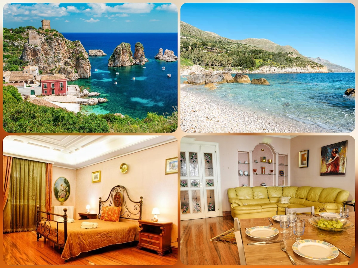 A 170 metros del mar, entre la almadraba y la Reserva Natural de Zingaro, se alternan varias calas, planta única y equipada con mosquiteras. El jardín, con ducha exterior, se extiende alrededor de toda la casa, con una cómoda barbacoa con fregadero, tumbonas, sofás y mesas al aire libre donde se puede almorzar, cenar o pasar agradables veladas. Abajo, en el mar, dos calas de uso exclusivo de la residencia, accesibles por pasajes de piedra, en el cercano Baglio, bar, estanco, pub, restaurantes, pizzerías, mercado, cajero automático.