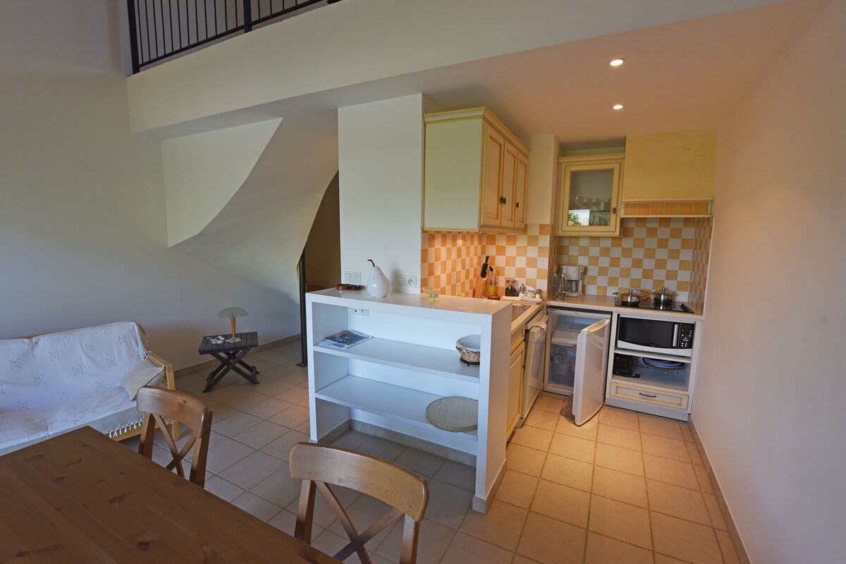 Alojamiento turístico amueblado de 4*: 65 m2 en un entorno verde. La terraza privada da a un bosque de robles y pinos con vistas a las colinas. Un dormitorio con una cama grande (calidad hotelería) y un baño en suite + una cocina abierta totalmente equipada y con vistas a una sala de estar con 2 bancos-cama individuales. Equipamiento completo, piscina compartida con los propietarios Estaremos encantados de hablar de buenas direcciones de la zona si los viajeros lo desean.