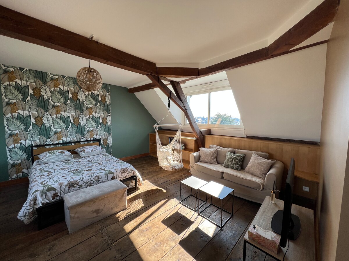 Serán bienvenidos en mi apartamento, Vivimos justo al lado . Lo he decorado y arreglado con mucho gusto. Espero que se sienta a gusto. Quería hacerlo acogedor, luminoso y cómodo. Tiene dos inconvenientes: el acceso es a través de una escalera de caracol estrecha, por lo que no siempre es fácil con maletas grandes. A pesar del aislamiento, puede hacer calor en verano, ya que está en el ático.