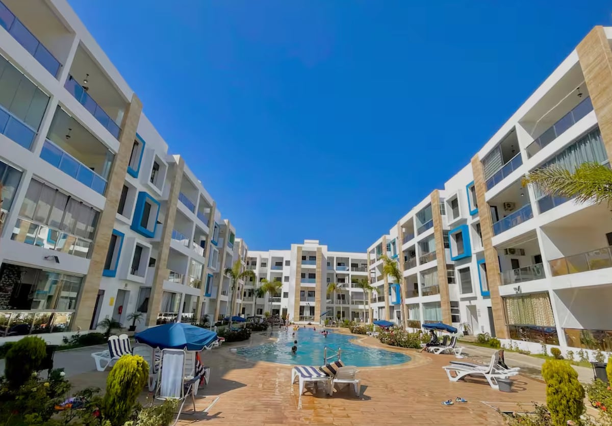 Welcome to our cozy apartment in Martil, just 5 minutes from the beach! It features AC in the living room and bedroom, year-round pools, a playground, and 24/7 security. Cafés, restaurants, and a supermarket are nearby. We prioritize cleanliness to ensure a comfortable stay for families and couples. Perfect for a relaxing vacation with your loved ones, and easily accessible to nearby attractions like Tetouan, Tangier, and Chefchaouen.