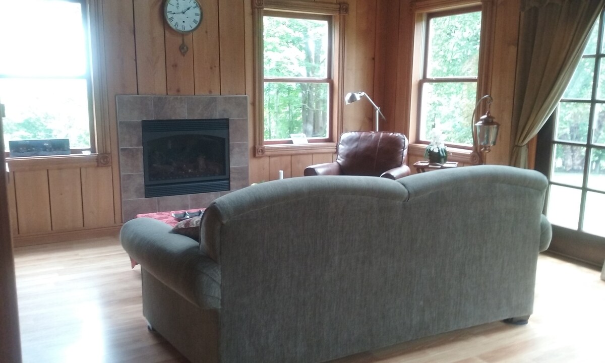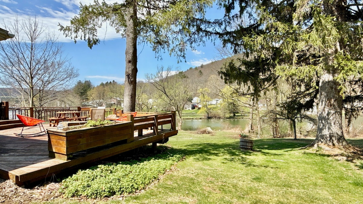 Encantadora casa de concepto abierto enclavada en las montañas Catskill, a 20 minutos al este de Oneonta. ¡Vistas exquisitas! (**Adyacente al circuito de motociclismo. No es visible, pero es ruidoso durante el día de 9:00 a 17:00, 4-5 días a la semana. Disfruta de una lectura matutina en nuestros cómodos sofás y sillones o acércate a la chimenea de gas por la noche. Explora nuestra propiedad de 20 acres o relájate en el amplio y soleado césped. La mesa y las sillas al aire libre junto a la chimenea son perfectas para una cena con vistas a las hermosas y antiguas montañas de Catskill.