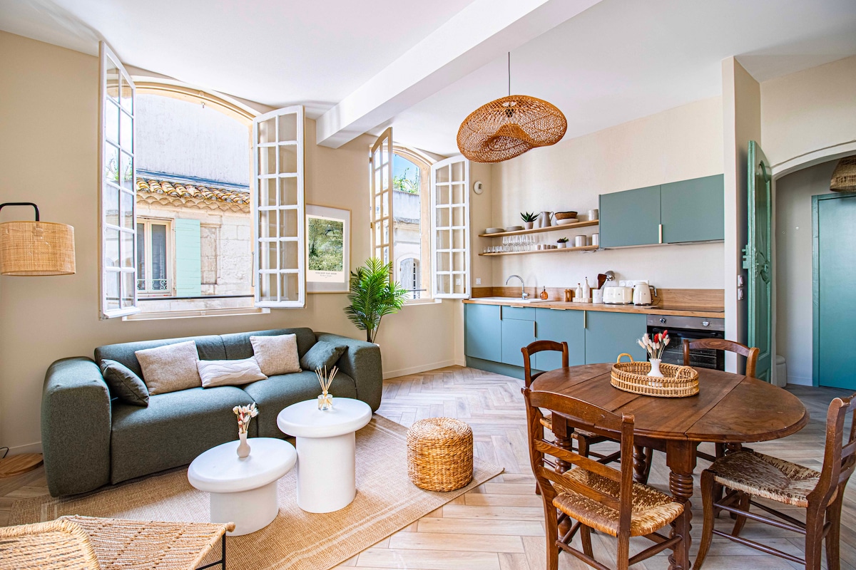 Welcome to this elegant apartment in the heart of Arles' historic center, on rue Jouvène. Perfect for a couple, a solo traveler or a business professional on the move, this bright T2 apartment is just a few steps from the Vincent Van Gogh Foundation and the Place du Forum. Entirely renovated with quality materials, it combines old-world charm with modern comfort. Enjoy its living room with period fireplace, open kitchen and peaceful bedroom. An ideal haven for discovering Arles.