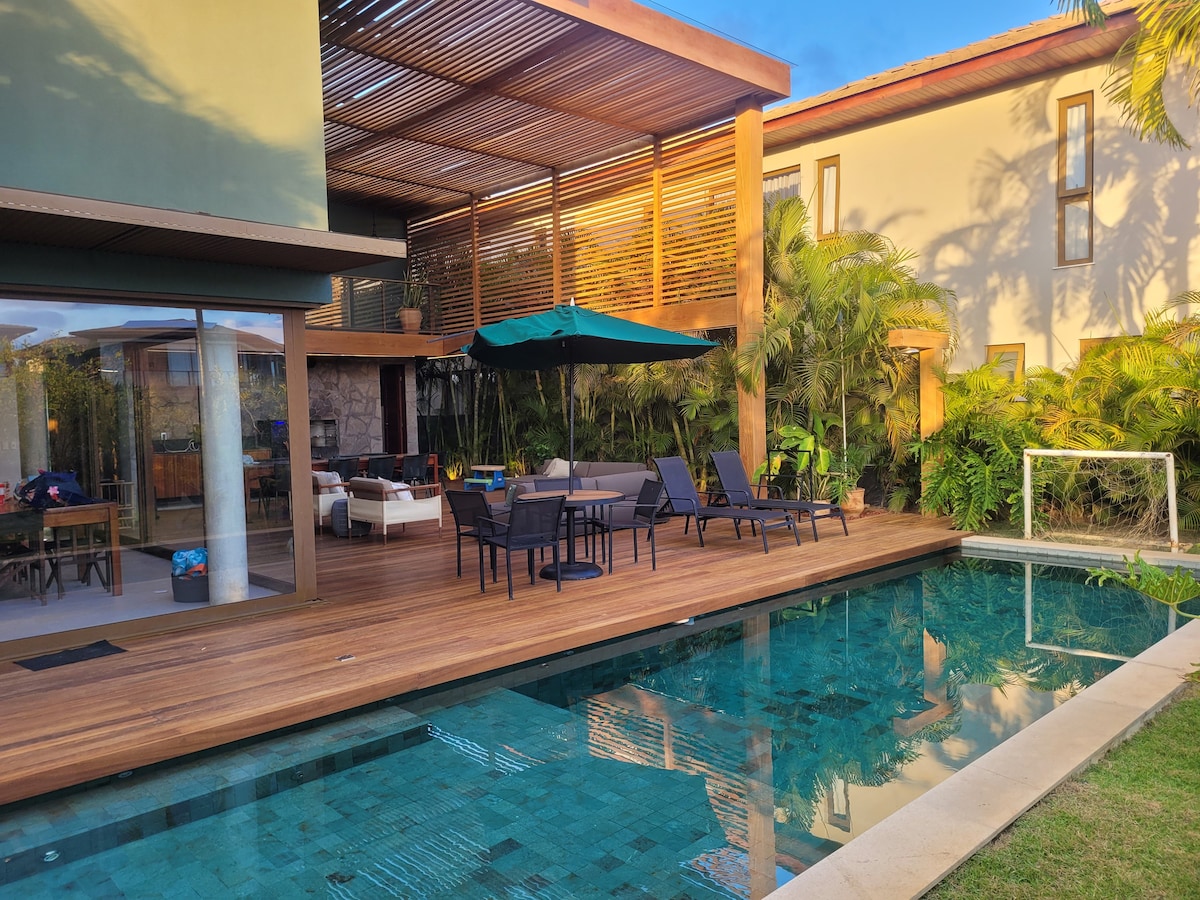 Casa moderna, finamente decorada y amueblada, con 6 suites climatizadas (con capacidad para 18 personas) y una dependencia (también climatizada), aparcamiento cubierto, piscina, comedores y salas de televisión, 2 baños, 2 zonas gourmet, a unos 150 metros del mar. Se encuentra en el Cond. Piscinas Naturais, Jacarandás, frente a la playa Piscinas Naturais, con seguridad las 24 horas, club, canchas, piscinas, parque infantil y gimnasio. El cond. ofrece una furgoneta ejecutiva los fines de semana hasta las 00:00 con viajes de ida y vuelta a la villa.