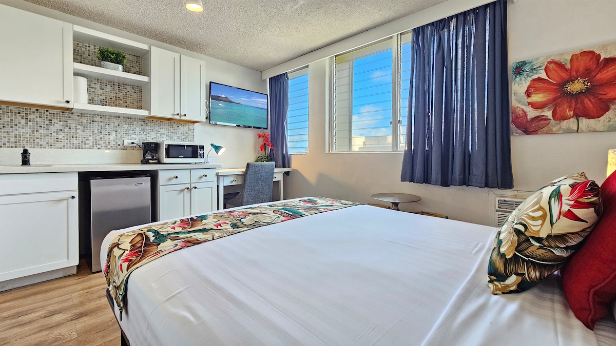 Departamento pequeño y acogedor con 236 pies cuadrados. Situado al comienzo de Waikiki, está a unos 10 minutos a pie de la playa y del corazón de Waikiki. Al otro lado del puente se encuentra el Centro de Convenciones y a 15 minutos a pie del centro comercial Ala Moana. El estudio está totalmente amueblado: cama tamaño queen,TV, wifi, nevera de tamaño medio, baño completo, microondas, cafetera, placa de inducción. El edificio tiene lavandería, piscina, jacuzzi y área de barbacoa; por un cargo adicional, puedes usar el gimnasio y el estacionamiento.