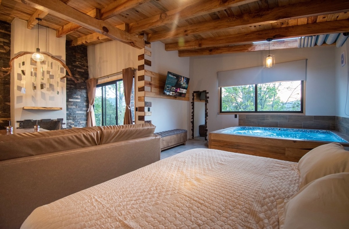Relájate en este espacio tan tranquilo y elegante, Disfruta del encantador entorno de esta romántica Cabaña Prieta. Se encuentra ubicado a 5 km de la plaza principal, esta rodeada de enormes pinos, cuenta con acabados de lujo, Cocina equipada, Jacuzzi, Terraza con vista Panoramica, TV con sistema Dish. Todo lo necesario para que pases un agradable noche con tu pareja en la naturaleza.