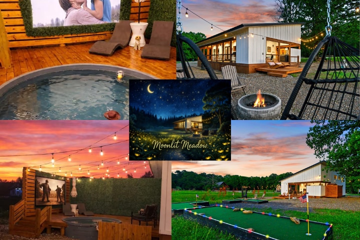 “Hammock Hideaway Broken Bow” ☀ 100” outdoor movie screen ☀ Large hot tub ☀ Giant family size hammock ☀ Outdoor fire pit ☀ Arcade console w/ favorite classics like Pac-Man + Dig Dug & more ☀ Indoor gas fireplace ☀ Children’s outdoor playset ☀ Corn hole ☀ Axe throwing game ☀ Smores Kit & starter bundle of firewood ☀ Life-size outdoor connect 4 ☀ Hook & ring game ☀ 3 Smart TVs w/ Amazon Prime, Disney+, Hulu, Netflix, etc ☀ 2 bedrooms; 1 king, 1 twin-over-full bunk bed + 1 queen sofa bed