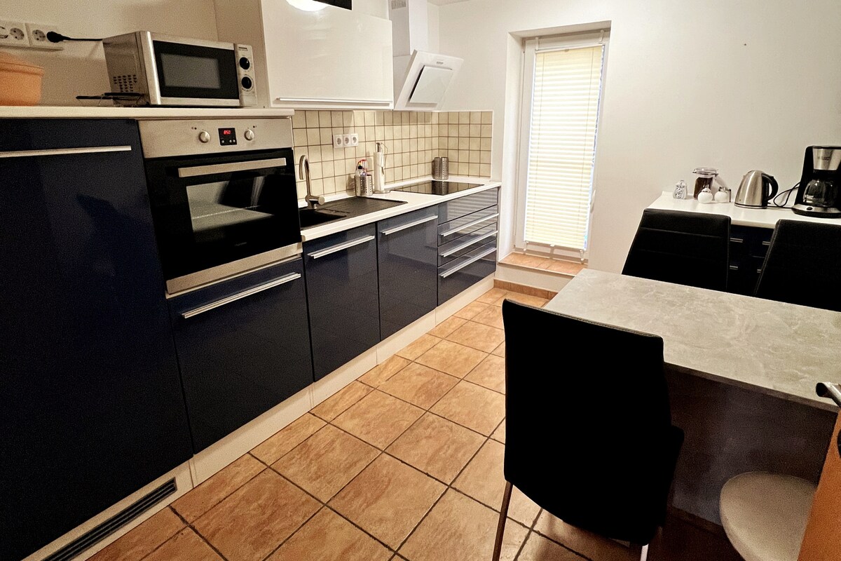 Encantador y tranquilo apartamento en una casa de campo con acceso independiente. Vivirá y dormirá en niveles separados. La cocina (congelador, nevera, lavavajillas, placa de inducción, horno, campana extractora) y el baño (lavabo doble, bidé) están totalmente equipados. Tiene su propia zona de jardín, una terraza en la casa y acceso directo a nuestro amplio salón. ¡El alojamiento NO es adecuado para una estancia con niños!