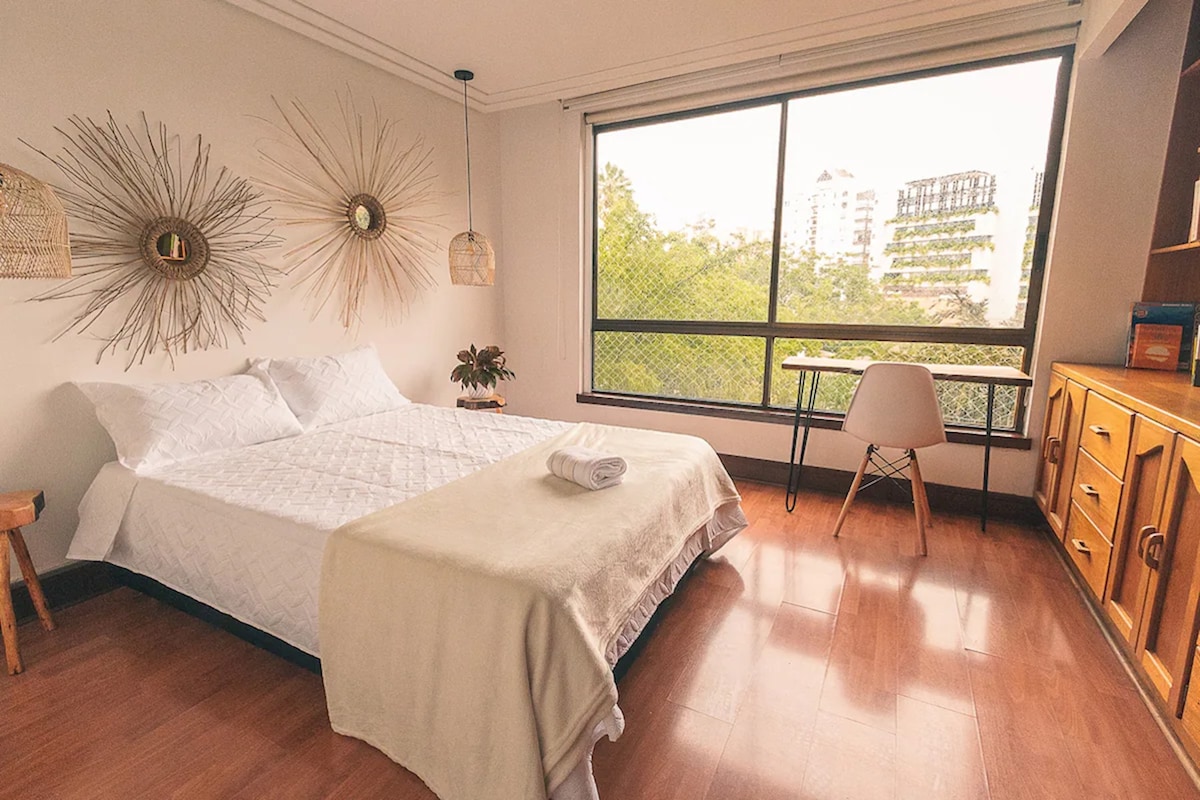 Ubicación estratégica para disfrutar Medellín Apartamento privado en zona central, cerca de la zona rosa de Laureles, la Unidad Deportiva de Belén y con fácil acceso a transporte público. Cuenta con cocina equipada, baño privado, escritorio, TV y wifi rápido. Además, puedes relajarte en las zonas comunes rodeadas de naturaleza, con una terraza ideal para hacer ejercicio o descansar mientras escuchas la cascada del estanque de peces.