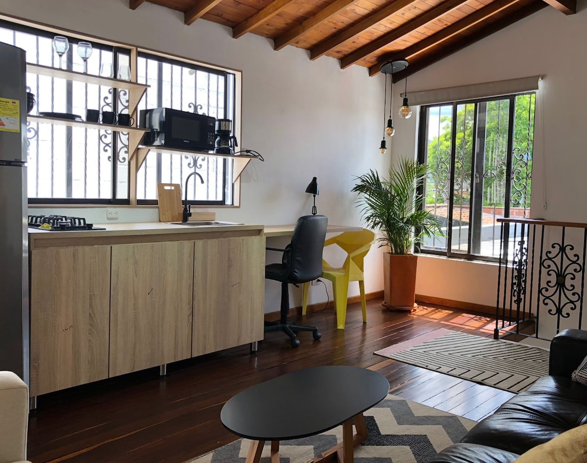 Apartamento muy cómodo con baño, una habitacion con cama king, cocina, espacio de trabajo con Internet de 300 M, televisor de 43'' smart tv, 2 baños, vestier, colchón o sofá cama para persona extra. Estarás ubicado en Envigado a 3 cuadras del metro, en un barrio tranquilo que representa las tradiciones de Medellín, cafés y tiendas en cada esquina, zonas deportivas.