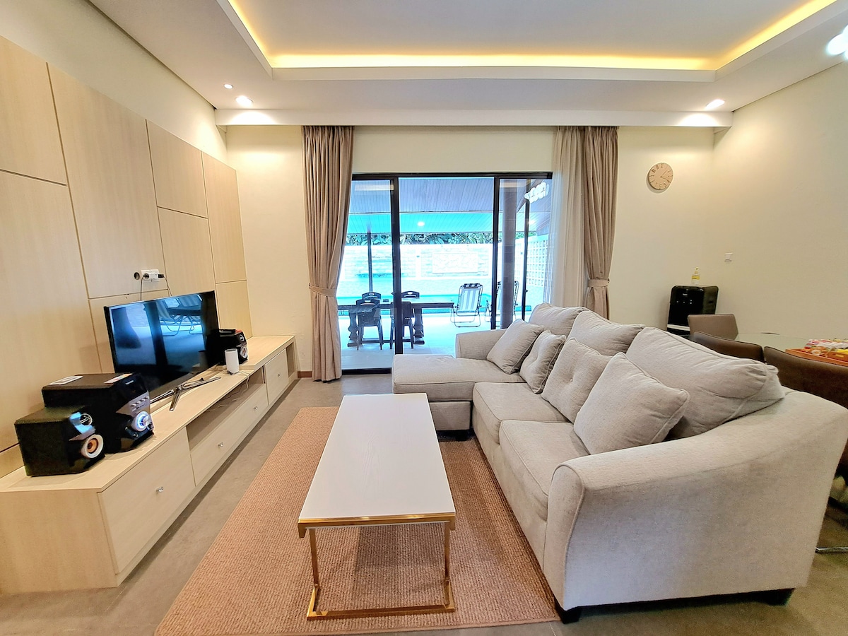 Relax with the whole family at this peaceful place. you can enjoy the breeze & sunset with mountain view frm the front door☘️ The Villa have 2BR, the main BR 2x2m bed + queensize matrass (+2single matrass bed fr extra charge) the 2'nd bedroom have Queen size bed + 1single matrass. SPECIAL PRICE ON WEEKDAYS!😎 you can use all facility in Club house : swimming pool, gym, tennis court, kids playground, pingpong,etc If you need car pick up or for daily usage, we can provide with extra charges