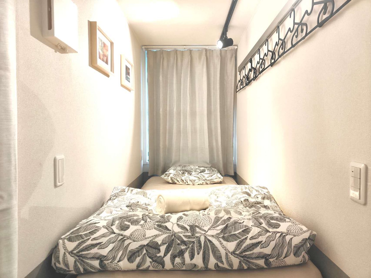 A solo 5 minutos de la estación de Nakano-Shimbashi (línea Marunouchi), este departamento de 22 m² y 1 habitación está a solo 2 paradas de Shinjuku, pero ubicado en una zona residencial tranquila. Cuenta con pisos de madera, iluminación suave y ventanas orientadas al sur con mucha luz solar. Dos camas semi-dobles con capacidad para 4 personas. Los tonos suaves de rosa y verde crean una sensación acogedora. Incluye una cocina compacta, heladera, microondas, wifi de alta velocidad y TV inteligente, ideal para parejas, amigos o familias pequeñas.