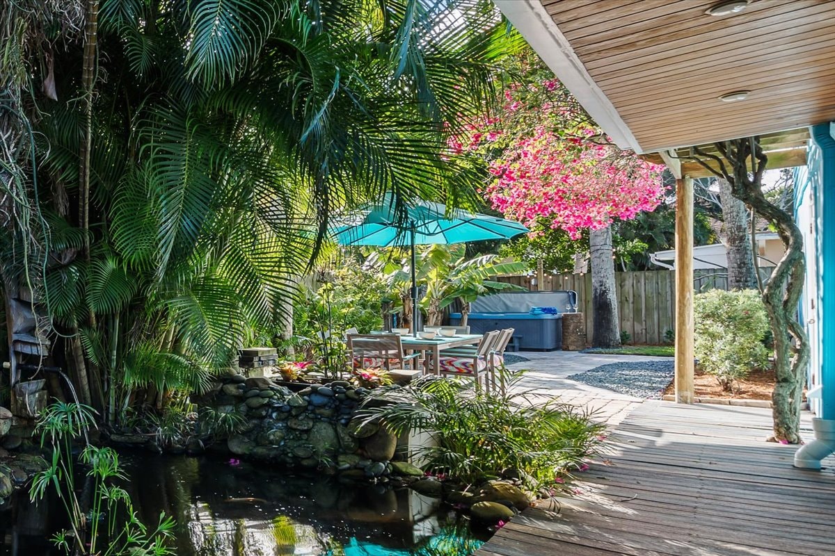 ¡Oasis tropical esperándote para disfrutar! Casa de 3 dormitorios y 2 baños, a pocos pasos de la playa, con una piscina privada climatizada, jacuzzi y bar tiki en el patio trasero tropical cercado. Casa que se admiten mascotas junto a una playa para perros. Dos de los dormitorios tienen camas tamaño king y televisores, TV de 55 pulgadas en la sala de estar, roku para streaming y todos los suministros de playa que necesitarás para tu estadía: sillas, grandes sombrillas, toallas y juguetes.