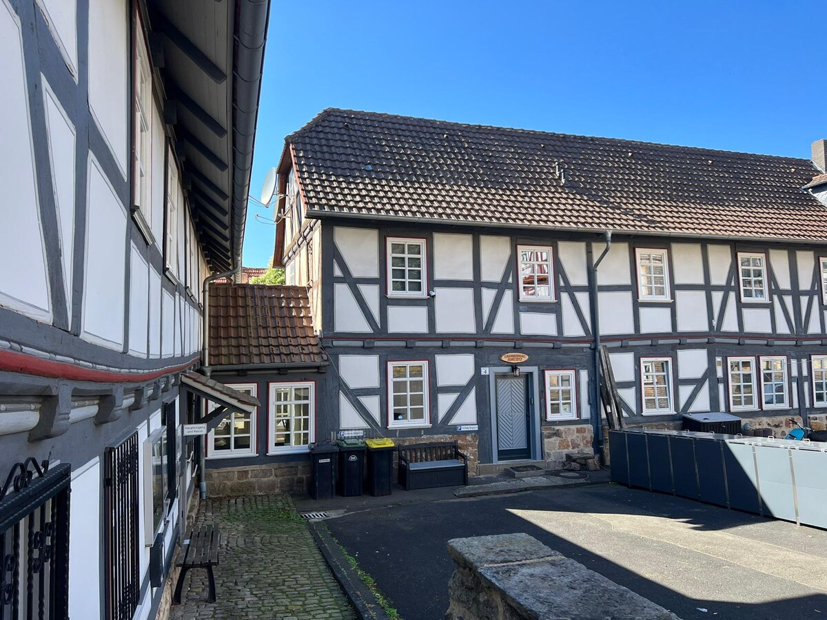 Es toda la parte izquierda de una gran casa histórica de entramado de madera recientemente renovada. Justo al lado del museo, en el centro de la ciudad y, sin embargo, muy tranquilo. El espacio habitable se distribuye en tres pisos. Una acogedora terraza cubierta conecta con la sala de estar. ¡Hay dos espacios de estacionamiento a la vuelta de la esquina! El check-in se realiza a través de una caja de seguridad para llaves en la puerta de entrada. Ten cuidado en el ático: ¡las vigas son gratuitas!