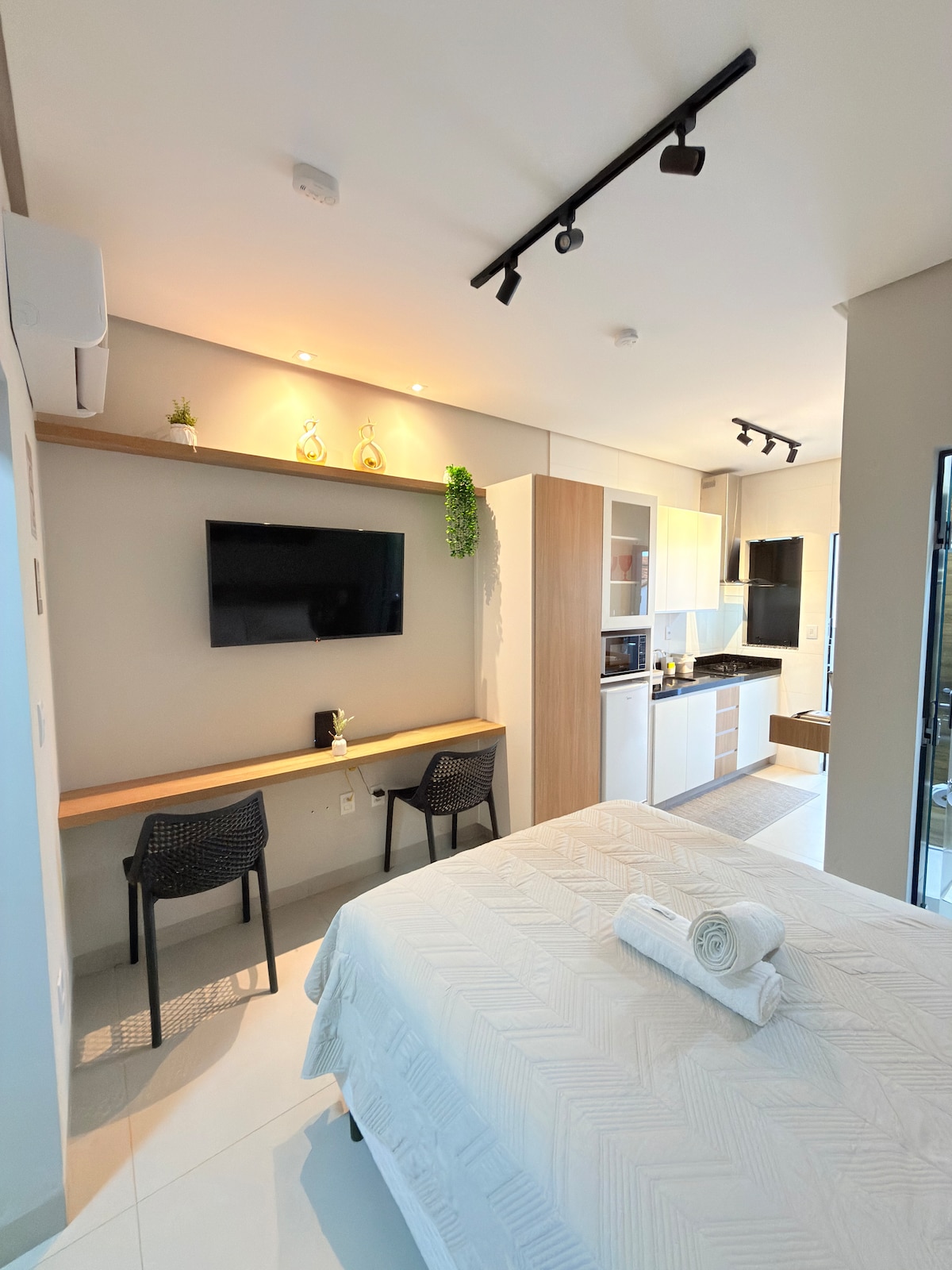 Bem vindo ! Aqui amamos hospedar e o nosso propósito é servir! Ah…o ap…é um studio funcional, aconchegante, acabamento de alta qualidade, 2 TVs 43 e 50 pol, Wi-Fi veloz e Ar condicionado. Prédio novo, a 100m da famosa Rua Santa Maria, com diversos comércios.