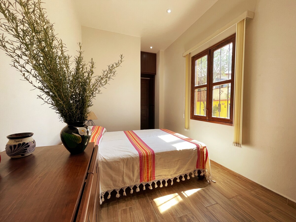 Disfruta de este lugar que se encuentra muy bien ubicado en el centro de la ciudad y en el que encontrarás un ambiente relajante y tranquilo, rodeado de plantas y flores . Un lugar hecho para el descanso después de visitar todos los atractivos turísticos de la ciudad. Podrás ir caminando al Centro Cultural Santo Domingo, restaurantes y galerias alrededor y en el Andador Turístico. El Zócalo de la ciudad y sus Portales... Puedes encontrar un lindo mercado y lavandería a una calle...
