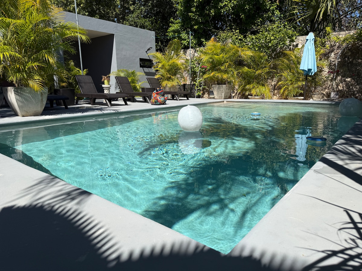 Pequeña y acojedora villa, con lo necesario para estancias largas y cortas, ideal para descansar o home office. Equipado con cocina completa, estancia, baño con agua caliente, AA en la habitación y ventiladores de techo en todas las áreas, wifi de alta velocidad, Patio privado con árboles, hermosa piscina compartida con 3 alojamientos en caso de que estén ocupados . Excelente ubicación, a unos pasos de Paseo Montejo, corredor gastronómico, Parque La Plancha. Walmart y bares.