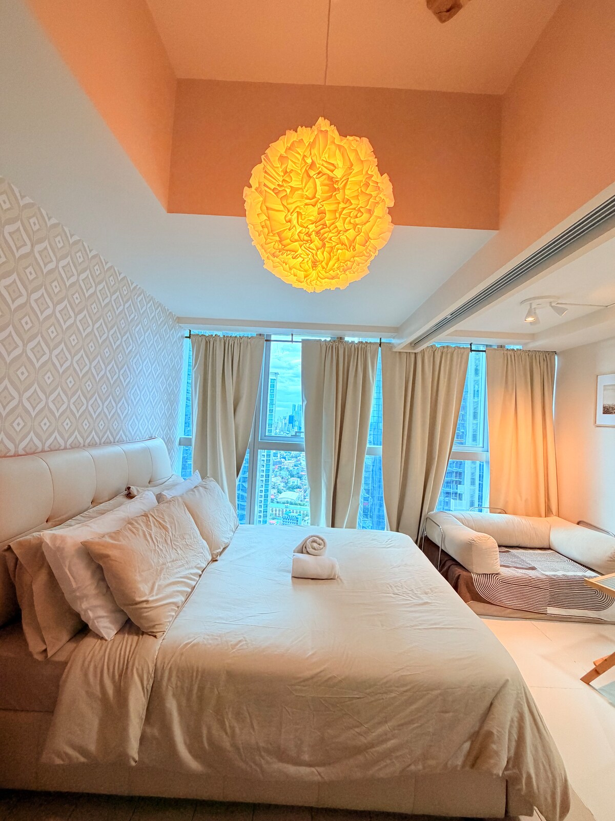 This newly renovated studio is at the 42nd floor of the stylish Milano Residence (beside Gramercy and Century Mall). It has unobstructed panoramic sunset view which photos cant do justice. The bed is an ortho bed which is great for your lower back…while the sofa is a sofa bed which fits 2 children. The soothing decor is well appointed and narrates the landscape of the Philippines. The unit was featured in an interior design magazine in the past being well edited despite being compact.
