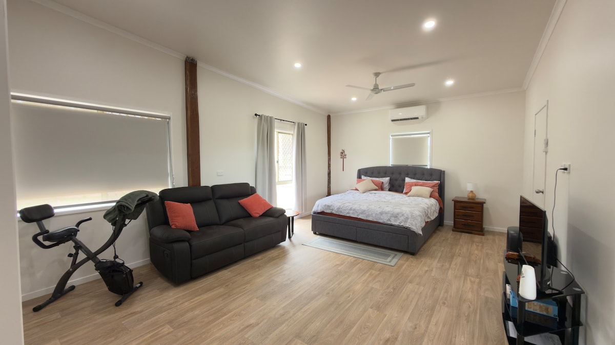 La habitación privada y espaciosa ofrece una cama tamaño queen, cocina americana y sofá con un baño accesible. Fuera del patio tiene vistas a la tierra de los arbustos y al río Burnett con asientos y barbacoa. 10 minutos al centro comercial y restaurantes, 15 minutos a Bundaberg CBD. Ten en cuenta que NO hay wifi, pero tenemos recepción de Telstra y Optus y que puedes acceder al televisor para los servicios de streaming. No permitimos perros en el lugar, esto es por su propia seguridad, ya que nuestra propiedad no está completamente vallada.
