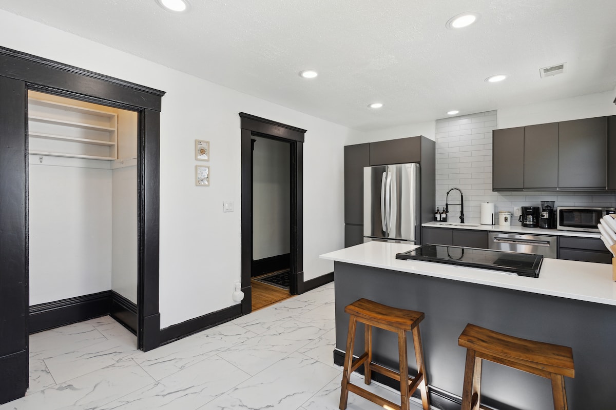 Esta casa de Lansing ha sido totalmente remodelada mientras mantiene su encanto vintage en un barrio tranquilo en una calle sin salida. Está cerca de todo lo que Lansing tiene para ofrecer, a 2 millas del borde del campus de MSU y a 1 milla del centro de Lansing. El primer piso se siente abierto y acogedor con un sofá cama y TV grande, sala de estar de concepto abierto cerca de la cocina, baños completos tanto en el primer y segundo piso, dormitorio queen en el piso principal, 2 dormitorios más arriba con cama tamaño king y camas completas. Y un bonito porche delantero para relajarse.
