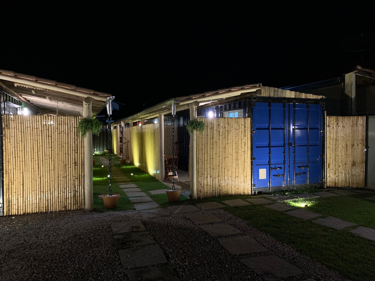Disfrute de la increíble experiencia de alojarse en nuestra casa contenedor, una de las 4 de nuestro encantador pueblo, ubicado dentro de un terreno de 5 mil metros cuadrados en medio de la naturaleza. En tan solo 850 metros, es posible visitar las playas de Felix, Conchas y Prumirim; además de la famosa Cachoeira do Prumirim (350 metros). La casa consta de un dormitorio/sala de estar y una cama doble. Tenemos smartTv e internet. Baño completo y una cocina exterior integrada con nuestro delicioso balcón y un jardín privado vallado.