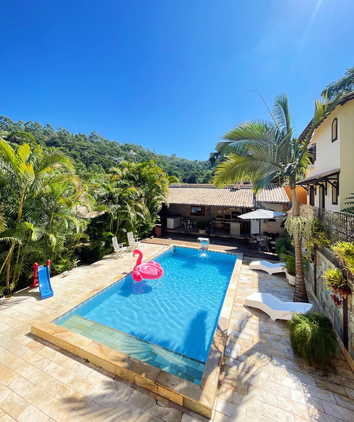 Casa dentro de un condominio, con cascada privada, pileta natural, pileta tradicional, sauna, jacuzzi, cancha de fútbol, fogata, parrilla, horno de pizza, sala de juegos, 2 empleados (un cuidador responsable del exterior y un cuidador responsable del interior) y con la posibilidad de contratar a un cocinero por un cargo adicional (R$ 200 por día).