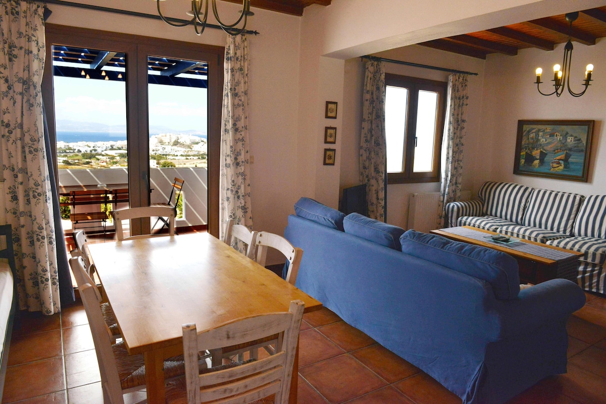 Villa de luxe , 8 personnes , 4 chambres, piscine privée, vue exceptionnelle . La villa "SEAKITE" située en hauteur ,offre une vue dégagée sur la mer Egée et un panorama ouvert sur les iles des cyclades du sud : Iraklia , Ios , Sikinos ... Le site , abrité du vent , permet de profiter pleinement du bord de mer en famille ou entre amis. Le calme ambiant , la situation géographique hors des foules touristiques sont propices au repos et invitent à contempler la mer depuis les terrasses ombragées .