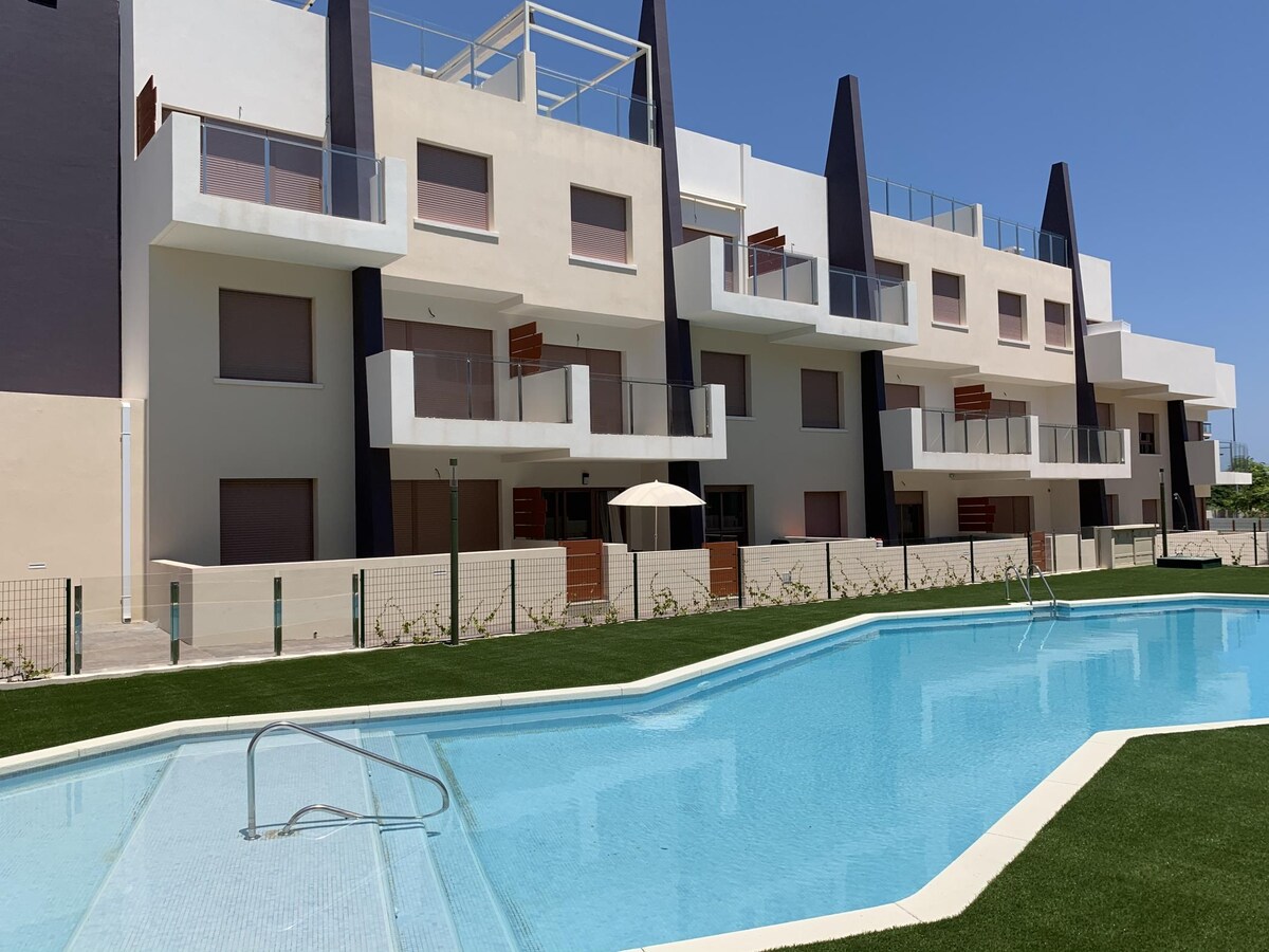 Buscas unas vacaciones en una localización moderna, a pocos metros de la playa? 'Bianca Beach' es perfecto para disfrutar en pareja, con familia o amigos. Construido en 2020, este residencial privado y completamente cerrado con muro perimetral tiene 2 piscinas. Está a 2 minutos andando de la playa Mil Palmeras, con 10 meses de sol al año. Este apartamento en planta baja está completamente equipado, con mucha luz. Lo más atractivo son sus terrazas, una con orientación sur y otra norte.