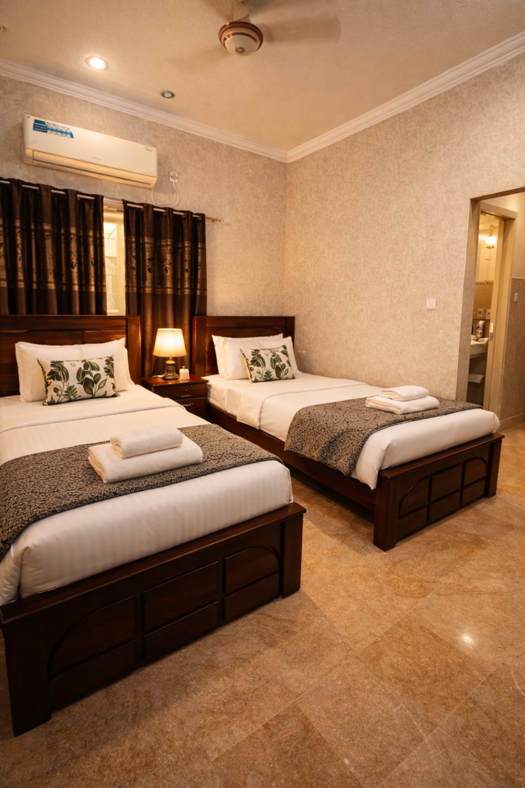 Disfrutá de un refugio acogedor en este dormitorio moderno y bien iluminado, con una decoración elegante, iluminación lateral suave y muebles elegantes. El ambiente cálido crea el marco perfecto para relajarse, mientras que los detalles cuidados, como el espacio para sentarse, las obras de arte y los acabados de primera calidad, aportan comodidad. Ubicado en la zona privilegiada de Lahore, este espacio es ideal para estadías cortas o largas, ya sea que viajes por trabajo, por placer o para una escapada de fin de semana. - Esta foto está editada digitalmente para mostrar el ambiente de iluminación. La configuración real puede variar ligeramente.