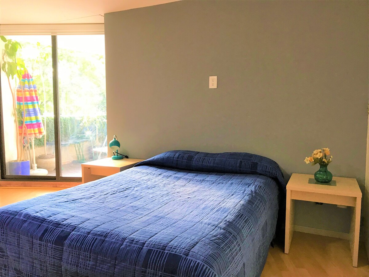 Tú mejor opción para hospedarte durante tu estancia del MUNDIAL FIFA 2026 a solo 10 minutos del estadio Banorte. La recámara, grande e iluminada está en un departamento excelentemente ubicado el corazón de la Zona de Hospitales de la CDMX y frente al TEC CDMX. Cuenta con baño privado grande, cómodo. Gran gran closet, cajonera, mesa de noche, escritorio y, TV así como acceso a un hermoso balcón, con gran vista, donde podrás trabajar o relajarte. Áreas comunes: Cocina equipada,comedor y sala!