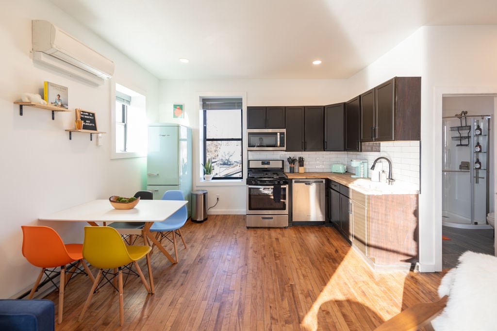 Apartamento estudio privado con entrada independiente a 1/2 milla de la I-90. NOTA: Calle concurrida en horario de oficina, pero el apartamento es tranquilo. Comida rápida, restaurantes, tienda de comestibles cerca. Cuenta con cama Murphy queen, futón completo con litera superior, cocina pequeña con fregadero pequeño, microondas, nevera/congelador completo, Keurig, tostadora y estufa de inducción. Baño separado, TV INTELIGENTE, wifi, aire acondicionado, calentador, café y té, así como aperitivos. Toallas, paños y artículos de aseo personal.