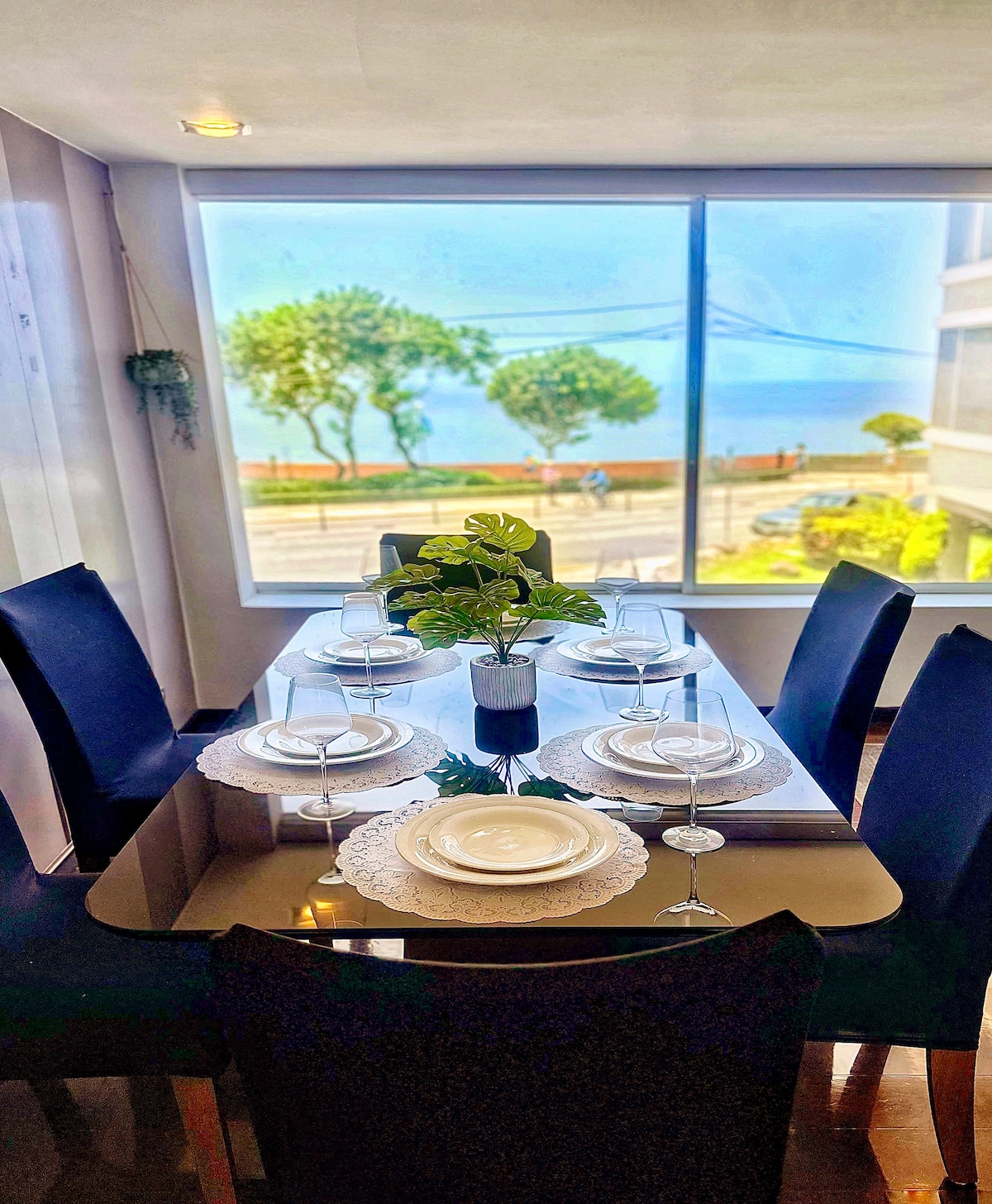 Departamento de estreno, amplio y full equipado, a solo 350 m del malecón de Miraflores. Ideal para descansar, trabajar o disfrutar de una experiencia tipo cine en casa gracias a su proyector HD y ecran automático. Cuenta con 2 dormitorios (principal con cama queen y TV 4K), sala con sofá cama queen y balcón con vista lateral al mar. Wifi 100MB. Contamos con cochera. Excelente ubicación, cerca de Larcomar, cafés, museos y restaurantes top.