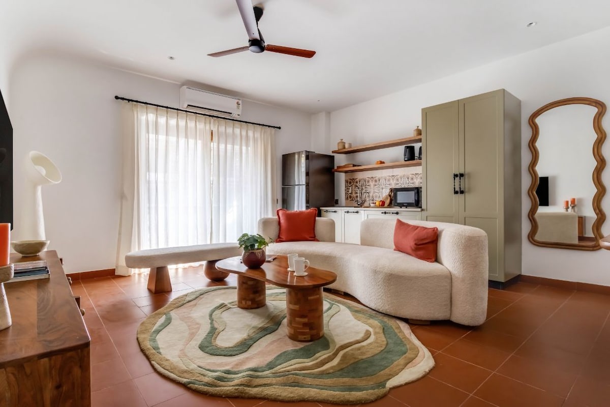 Modern 1BR with Pool, 5min drive to Candolim Beach