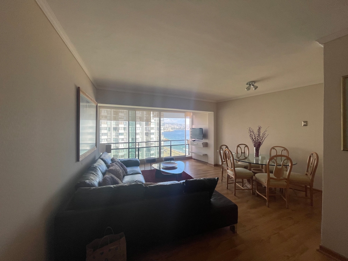 Lindo y elegante departamento amoblado con gran vista al mar, frente al Hotel Sheraton de Viña del Mar. Es muy luminoso y está a pasos del centro de viña, de la playa, del reloj de flores y de la av. Perú. Es ideal para una pareja (cama king) y tiene espacio suficiente para incorporar una cuna (no incluida). Desde el departamento, puedes caminar por el borde costero. Tiene 1 estacionamiento privado techado, cuenta con lavandería y piscina. Tiene conserjería dia y noche. Mínimo 2 noches