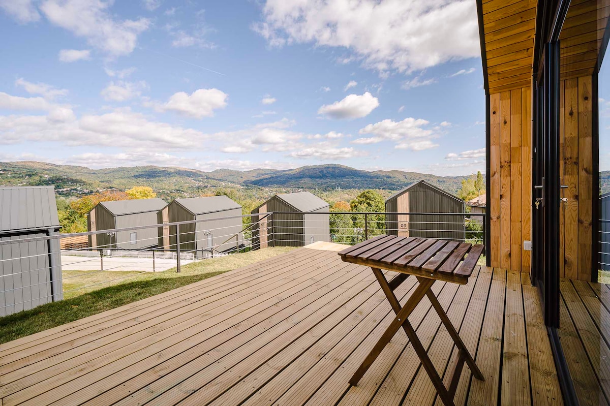 En medio de un huerto peculiar, vas a encontrar una casa rural moderna y minimalista, envuelta en madera. Detrás de las grandes ventanas, la luz natural impregna el interior y resalta el espacio abierto y los acabados limpios. La bañera exterior completa la imagen relajante del lugar, ya que invita a disfrutar de momentos de relax. Esta reinterpretación moderna de la casa ofrece una experiencia especial, que combina la comodidad contemporánea con la belleza natural del entorno circundante que puede irrumpir con un ruido inesperado.