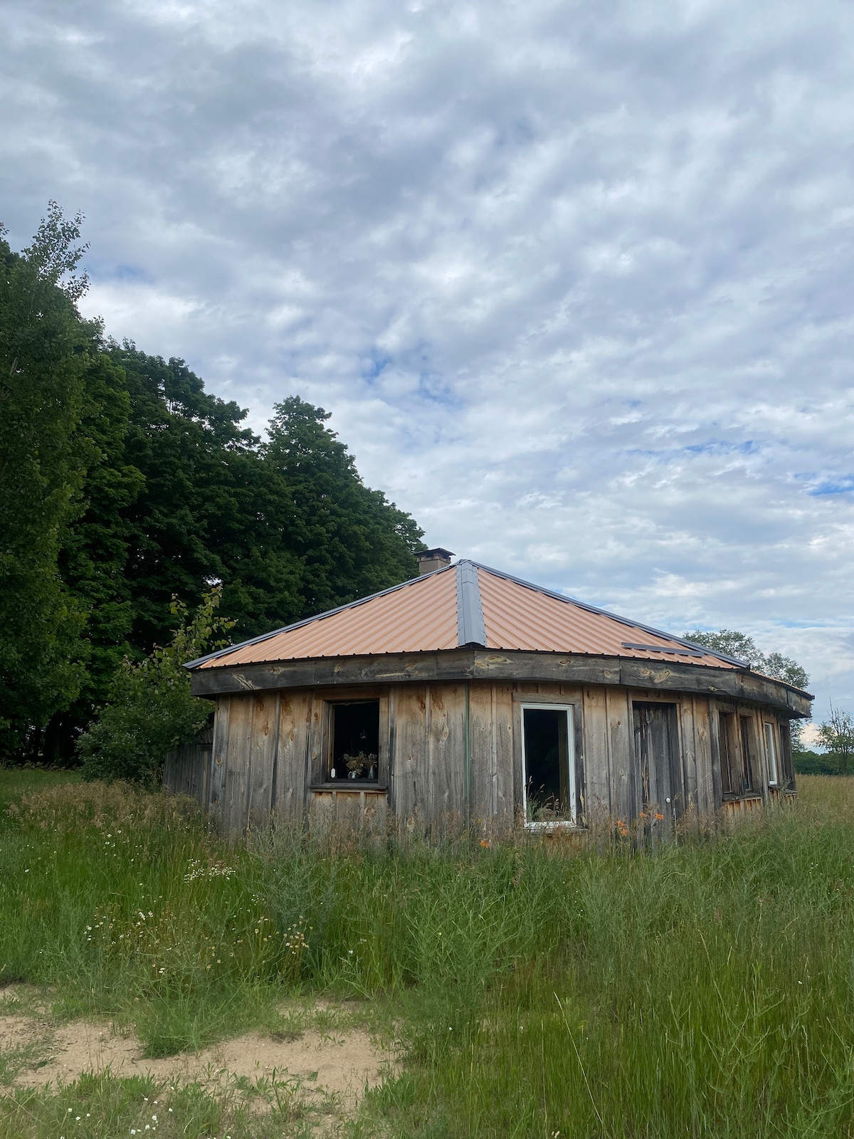 Una cabaña hexagonal construida a mano y hecha con amor en Earthwork Farm. La Casa en la Colina ha sido el hogar de muchas residencias de artistas a lo largo de los años y ha proporcionado a muchas personas un lugar tranquilo para la reflexión y la restauración. La cabaña es rústica y está bastante cerca de la naturaleza. También cuenta con algunos servicios menos rústicos como wifi, lavadora/secadora, nevera, inodoro y ducha. Desconecta de la rutina en este alojamiento único y relajante.