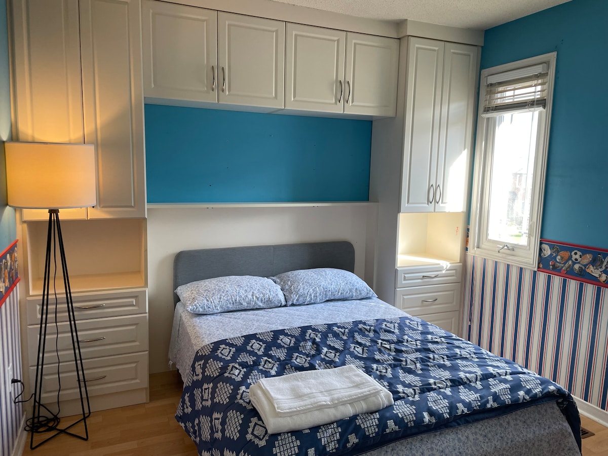 Ubicación céntrica privilegiada cerca de autobuses, autopista, parques, tiendas, comestibles, restaurantes y cine. A minutos de la autopista principal QEW, a 35 minutos en coche de Toronto y del aeropuerto. Es un apartamento espacioso de 2 niveles divididos. Baño y dormitorio en el nivel superior. TV y cocina en la planta baja. La cocina está equipada con nevera, ollas, microondas, tostadora, freidora de aire, utensilios y cafetera. Smart TV, Netflix, wifi, aparcamiento y lavandería privada están incluidos. No se permiten mascotas, fumar ni fiestas.