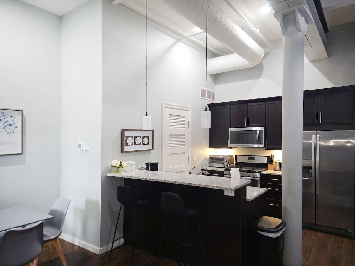 Loft de 2 dormitorios y 1 baño que ha sido bellamente renovado con cocinas, baños, muebles, etc. totalmente nuevos. Situado en el corazón del centro de la ciudad, a pocas manzanas del Centro de Convenciones, el distrito de Power & Light, el Sprint Center y el tranvía gratuito de Kansas City que te llevará desde River Market hasta Crown Center y Union Station.