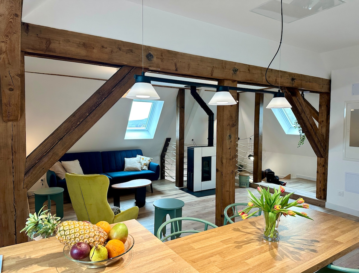 This exceptional triplex is perched between the stones of the town's ancient medieval walls. Between exposed beams, 12th-century stone walls and bay windows. 3 floors distribute the cosy nest. An entrance, a bathroom with bathtub. On the 1st floor: a space combining a kitchen, dining room, living room and access to a private terrace. Upstairs is a cozy bedroom. With independent entrance, this is an immersive experience in the medieval town of Riquewihr, and the ideal place to discover Alsace.