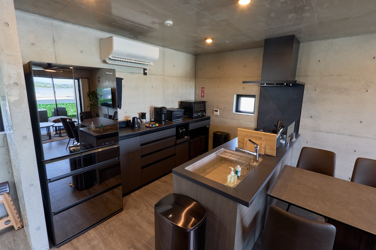◆ LO más destacable ◆ Una villa privada nueva con un diseño moderno de hormigón y tragaluces que llenan el espacio de luz natural. Disfrute de un diseño espacioso de 100㎡ y de impresionantes vistas completas al mar desde la sala de estar, el comedor, la cocina y el baño. Ubicación A solo 10 minutos del aeropuerto de Miyako y a 5 minutos de la famosa playa de Yonaha Maehama. A poca distancia a pie hay cafeterías de moda, restaurantes locales y supermercados, ideales para una estadía relajante en la isla.