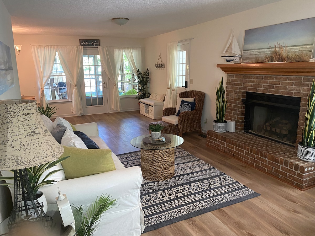 Casa tranquila recién renovada con 2 dormitorios, 2 baños y un estudio, ubicada en el extremo del lago y con acceso cerrado. Muchos árboles con fogata y muelle en la parte trasera. Sentate en la terraza trasera y observá colibríes, ciervos, gansos, patos, garzas azules, cardenales, ardillas y mucho más. Kayak/tabla de surf de remo a la pequeña zona de playa privada con cenadores, tenis, baloncesto, put-put, pesca, etc. Justo al lado de la interestatal, a menos de 2 millas: CVS, estaciones de servicio, Kroger, Walmart, teatro, restaurantes, salón de uñas, tienda de automóviles, Lowes y Chif-fil-a